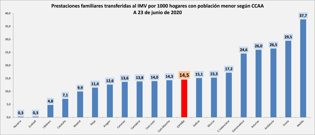 Los datos sobre las prestaciones familiares transferidas de oficio al IMV proceden del Ministerio. Hay dos tablas algo diferentes, incluyendo la difundida por la web huffingtonpost.es, también procedente del Ministerio. Los resultados son similares, aunque se da preferencia a la que incluyen información relativa a Euskadi y Navarra.